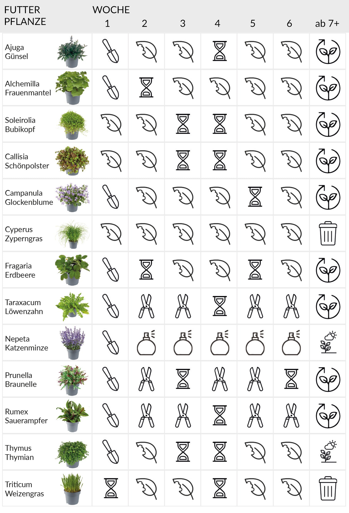 Manche Pflanzen sind nach einiger Zeit abgefressen und müssen entsorgt werden, andere Pflanzen werden mit der richtigen Pflege wieder nachwachsen und können dann wieder verfüttert werden. Schaue für Details in unseren Pflegekarten nach.