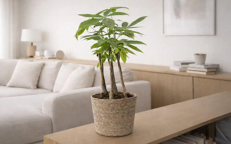 Die äußerst pflegeleichte Glückskastanie fällt besonders mit ihren schmalen Blättern und dem dekorativ geflochtenen Stamm auf. Sie gilt im asiatischen Raum als Symbol für Wohlstand und Glück und kann auch in deinem Wohnzimmer bald für ein grünes, positives Raumklima sorgen. Der verdickte Stamm kann gut Wasser speichern und somit brauchst du dich fast gar nicht um die Pachira kümmern. An einem hellen Standort wird sie ihre buschige Krone schon bald mit vielen neuen Blättern verdichten und schnell weiterwachsen. Große Glückskastanien können bis zu 2 Meter hoch werden und daher hat sie auch den Beinamen "Zimmerbaum" erhalten. Zusätzlich ist sie sehr tierfreundlich und bestens für Haushalte mit Katzen oder Hunden geeignet.