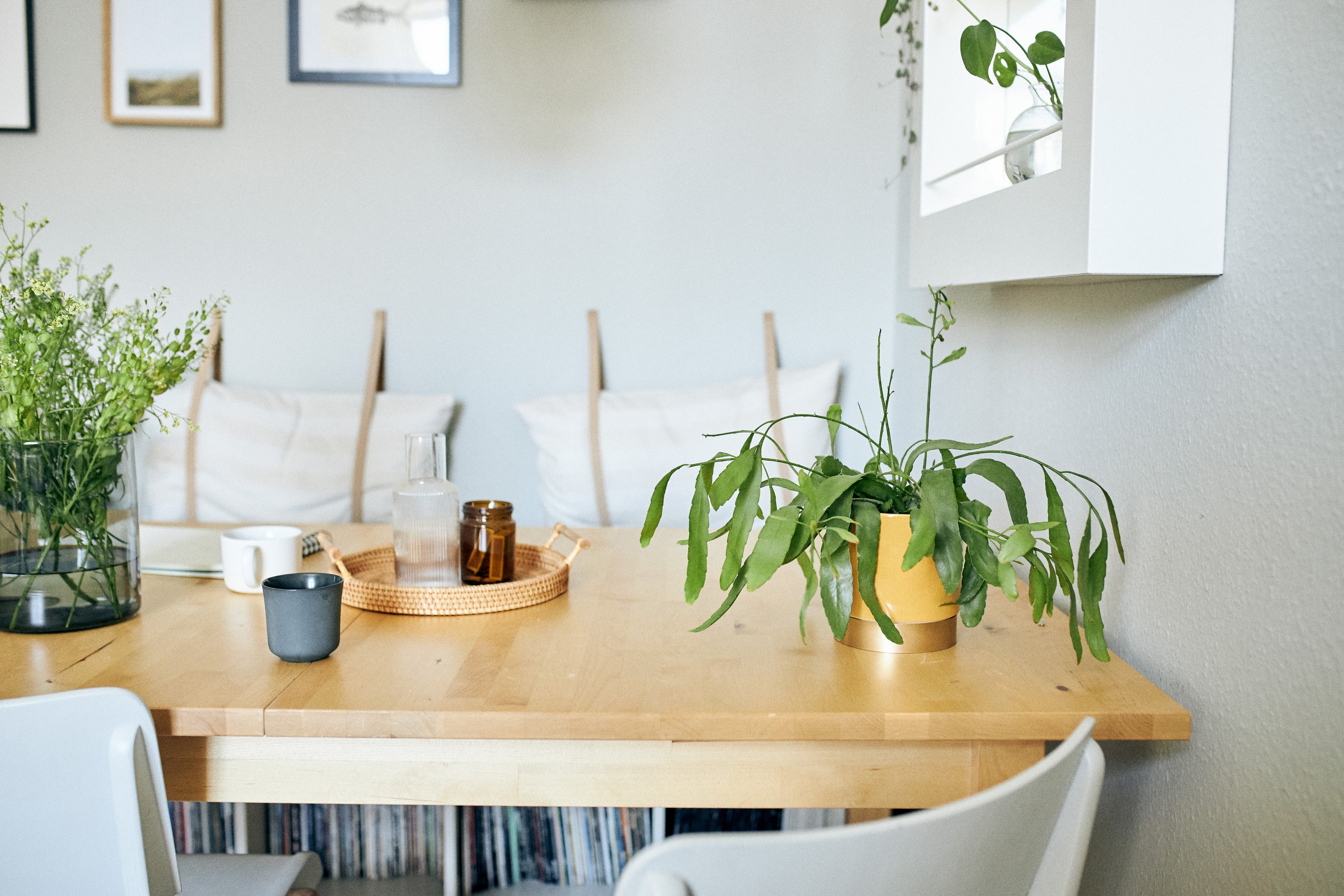 Tatsächlich finden sich in Leonies lichtdurchfluteter Altbauwohnung vor allem pflegeleichte Pflanzen. Davon aber jede Menge. „In meiner letzten Wohnung hatte ich genau drei Pflanzen. Die habe ich kaum beachtet und sie haben es doch überlebt. In dieser Wohnung haben wir keinen Balkon, deshalb hatte ich das große Bedürfnis, mir schönes Grün in meine vier Wände zu holen”, erklärt Leonie ihren kleinen Jungle. „Und es hat wohl funktioniert”, grinst sie.