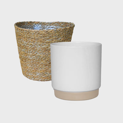 Dieses trendige Übertopf-Set passt perfekt zur 2er Pflanzenbox mit zwei kleinen Pflanzen. Die Kombination aus weißem Keramiktopf und Seegraskorb ist perfekt für jeden geeignet. Besonders in Kombination mit deinen neuen Zimmerpflanzen kommt die natürliche Optik besonders hervor.