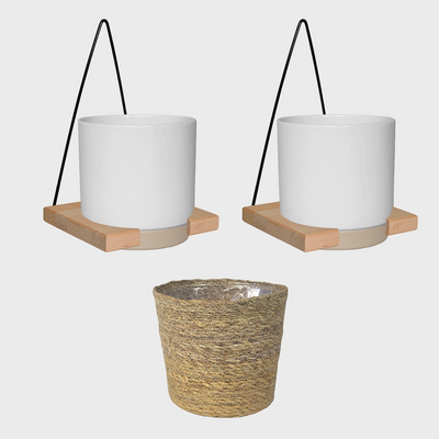 Dieses trendige Übertopf-Set passt perfekt zur 3er Pflanzenbox mit hängenden Pflanzen. Die Töpfe sind eine Mischung aus Keramik und stylischem Bastgeflecht. Einfach mitbestellen und deine neuen Pflanzen kinderleicht in deiner Wohnung dekorieren. Erhältlich in verschiedenen Farben.