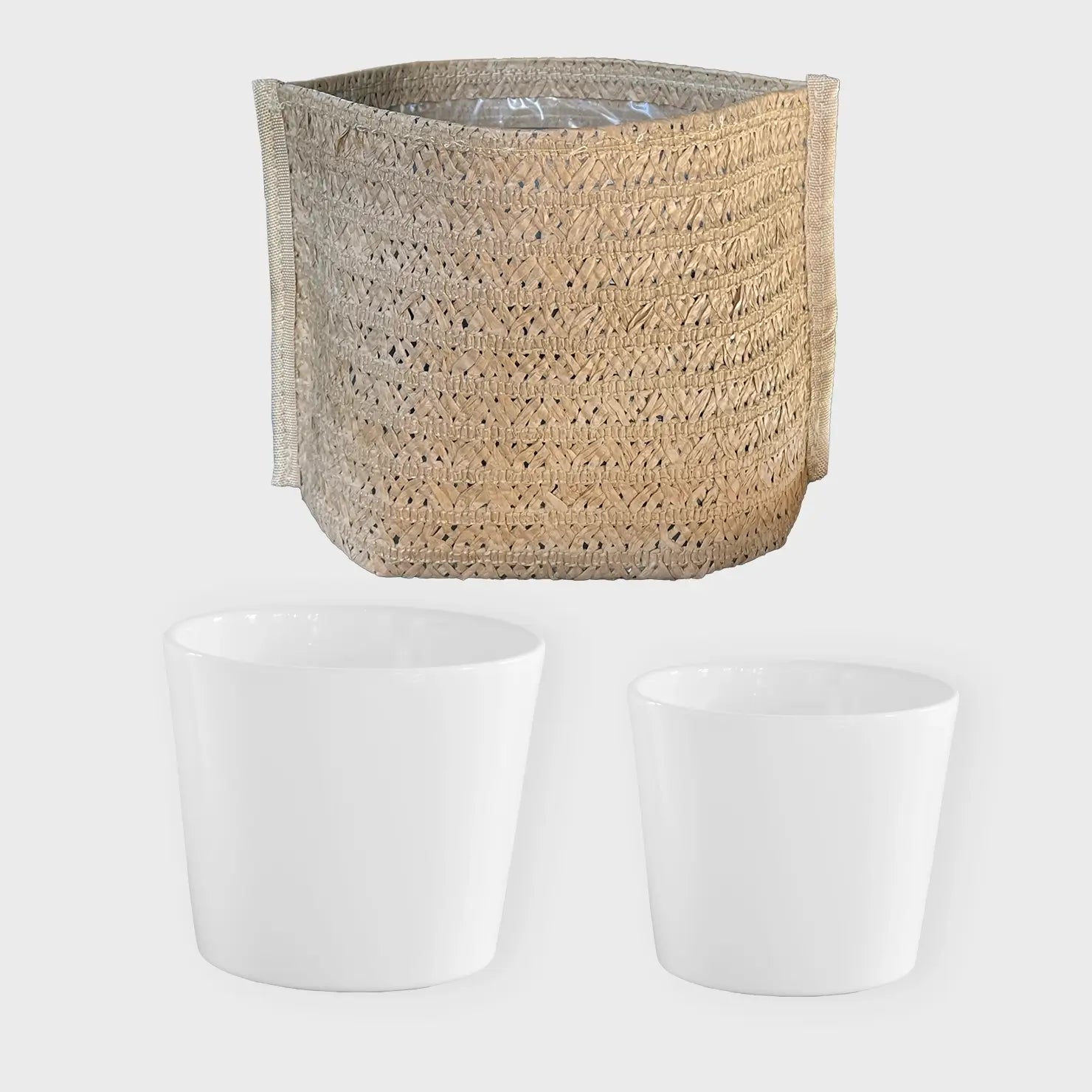 Dieses trendige Übertopf-Set passt perfekt zur 3er Pflanzenbox mit kleinen Pflanzen. Die Töpfe sind eine Mischung aus Keramik und stylischem Bastgeflecht. Einfach mitbestellen und deine neuen Pflanzen kinderleicht in deiner Wohnung dekorieren. Erhältlich in verschiedenen Farben.
