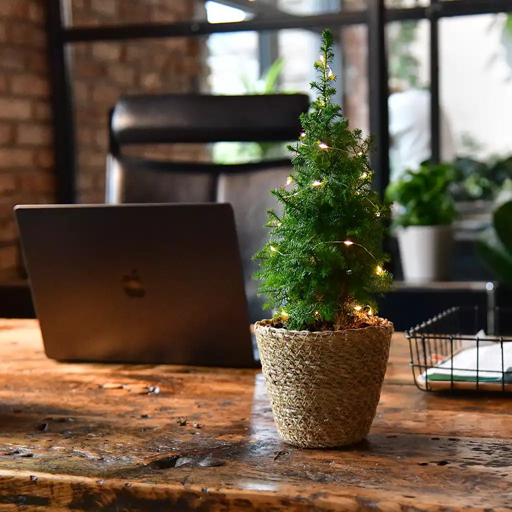 Dekoriere dein Set aus 6 kleinen Weihnachtsbäumen mit schönen Seegraskörben und je einer schönen Lichterkette. 10 kleine LEDs sind in den goldenen Draht eingearbeitet und verbreiten ein angenehmes, weihnachtliches Licht. Mit dem Set aus Übertopf und Lichterkette wird dein kleinen Tannenbäumchen zur perfekten Tischdeko.