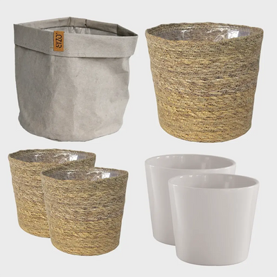 Dieses trendige Übertopf-Set passt perfekt zur 6er Pflanzenbox. Die Töpfe sind eine Mischung aus Keramik, Seegrasgeflecht und trendigen Pflanzsäcken mit Innenfolie. Einfach mit bestellen und deine neuen Pflanzen kinderleicht in deiner Wohnung dekorieren. Erhältlich in verschiedenen Farben.
