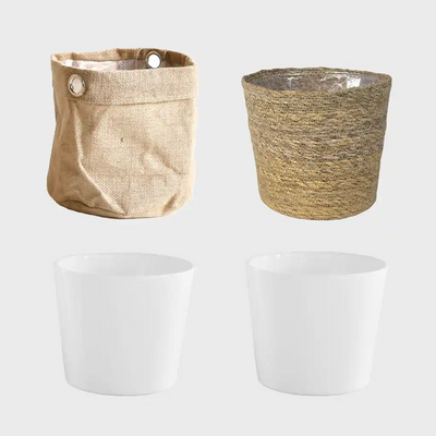 Dieses trendige Übertopf-Set haben wir dir passend zur 4er Pflanzenbox mit 1 großen, 1 mittleren und 2 kleinen Pflanze zusammengestellt. Die Töpfe sind eine Mischung aus Keramik und stylischem Bastgepflecht. Einfach mit bestellen und deine neuen Pflanzen kinderleicht in deiner Wohnung dekorieren. Erhältlich in verschiedenen Farben.