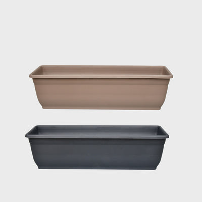 Der Taupefarbene Balkonkasten kommt mit einem integrierten Wasserspeicher.