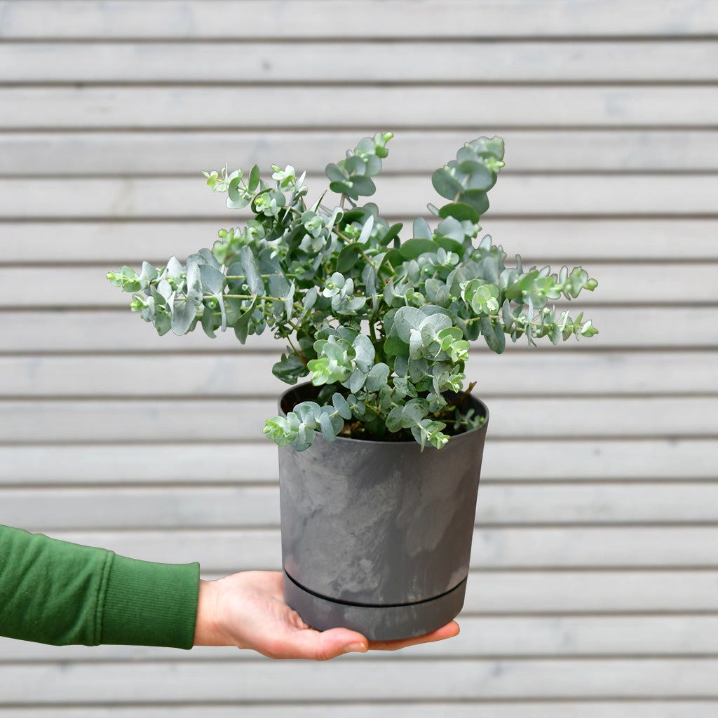 Der Eukalyptus cinerea bildet genau die silbergrünen Blätterranken mit runden Blättern, mit denen du so herrlich dekorieren kannst. Die Blätter sind voller ätherischer Öle, die wunderbar riechen und lästige Insekten vertreiben. In einem Kübel gepflanzt kann dein Eukalyptus zu einem beeindruckend Busch heranwachsen. Du kannst ihn aber auch zur deko auf den Tisch stellen oder in einen Hängetopf stellen.