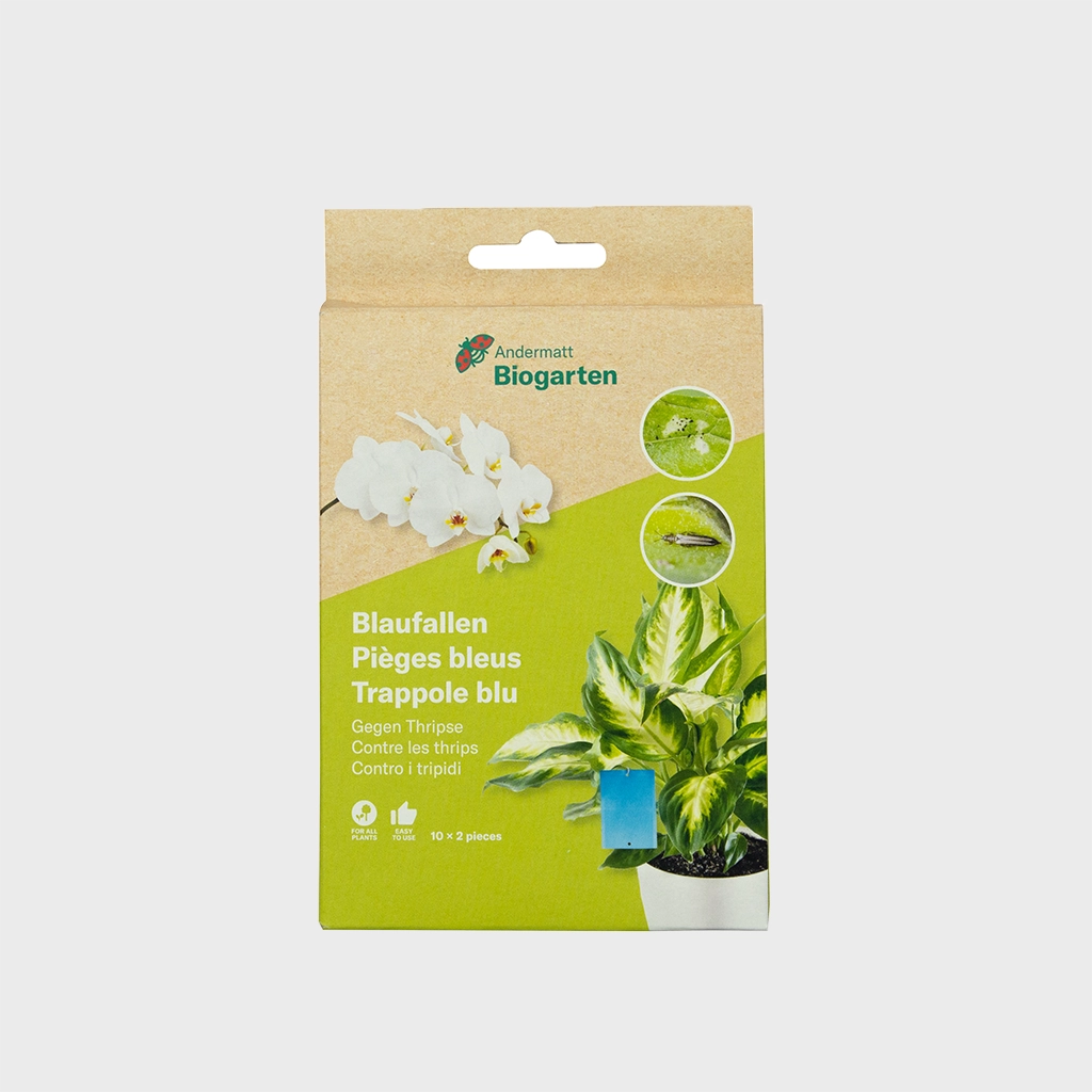Die Blautafeln sind giftfrei und kleben beidseitig, sodass möglichst viele erwachsene Thripse gefangen werden können. Hänge die Blautafel mit dem mitgelieferten Band möglichst nah am Blatt deiner Pflanze auf, wo der Befall am stärksten ist.