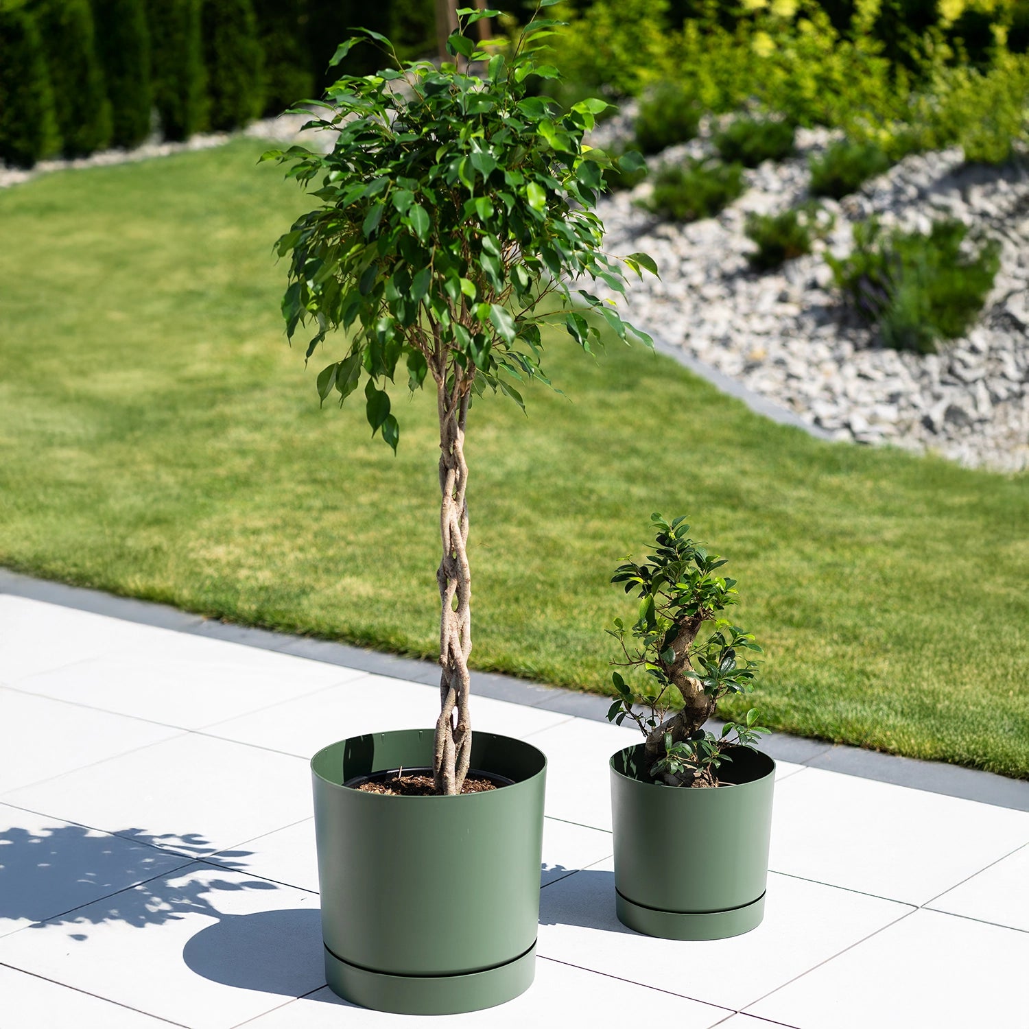 Hergestellt ist der Topf größtenteils aus recyceltem Kunststoff, das UV- und frostbeständig ist. Das leichte Material macht es dir leicht, deine Pflanze zu verschieben, wenn du das möchtest oder es Zeit ist, dass deine Pflanzen ins Sommer-/Winterquartier ziehen.