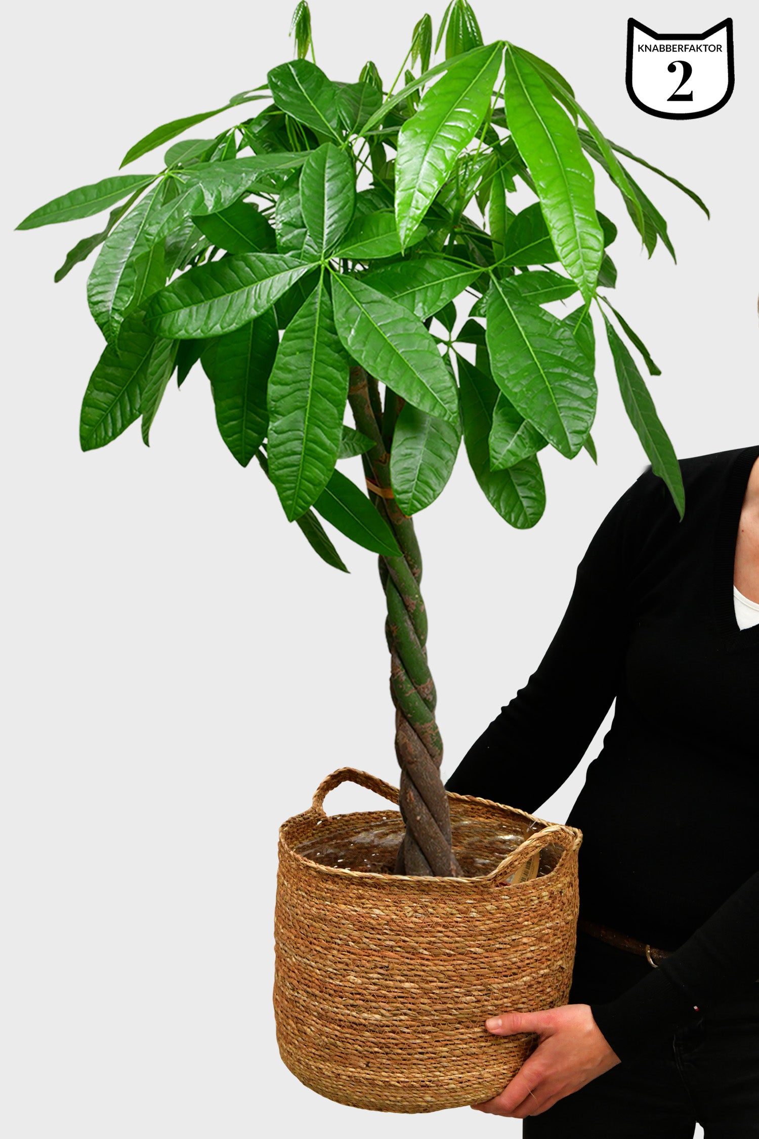 Die Pachira macht einfach glücklich, weil sie unkompliziert ist, schnell wächst und mit ihren gefingerten Blättern und dem geflochtenen Stamm, ein bisschen den Stil eines echten Baumes mitbringt. Genieße deine Glückskastanie auch zusammen mit deiner Katze, denn die Pachira ist ungiftig und wird nicht so schnell angeknabbert.