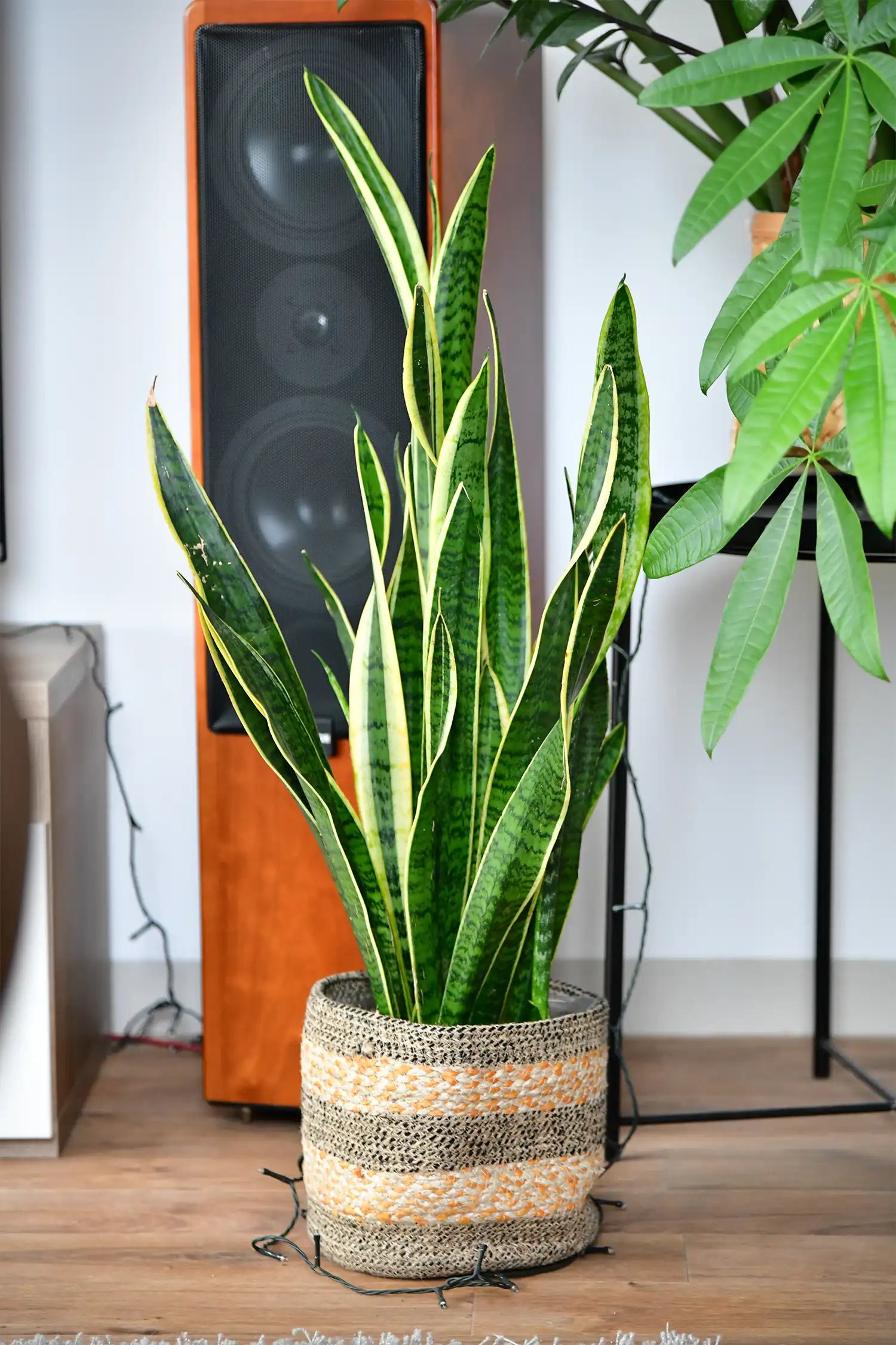 Die gerdaden Sukkulentenblätter mit der gelben Kante sind typisch für den Bogenhanf. namens Schwiegermutterzunge. Als Große Pflanzenist die Sansevieria bestens für die Raumdeko im Bürodeko, Ladenlokal oder trendige Wohnzimmer geeignet, da sie ein echter luftreiger ist und sowohl in der Sonne als auch im eher dunkeln Büro stehen kann.