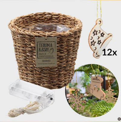 Das Dekoset passend zum großen Weihnachtsbaum macht es dir kinderleicht, den Baum direkt zu schmücken. In dem Set erhältst du den passenden Seegraskorb, die Lichterkette mit 100LEDs und dem Baumschmuck aus Holzanhängern, sodass wir auch hier auf Plastik verzichten können.