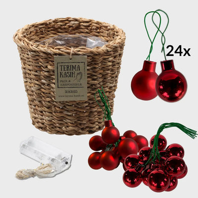 Das Dekoset passend zum großen Weihnachtsbaum macht es dir kinderleicht, den Baum direkt zu schmücken. In dem Set erhältst du den passenden Seegraskorb, die Lichterkette mit 100LEDs und dem Baumschuck aus roten Glaskugeln, sodass wir auch hier auf Plastik verzichten können.