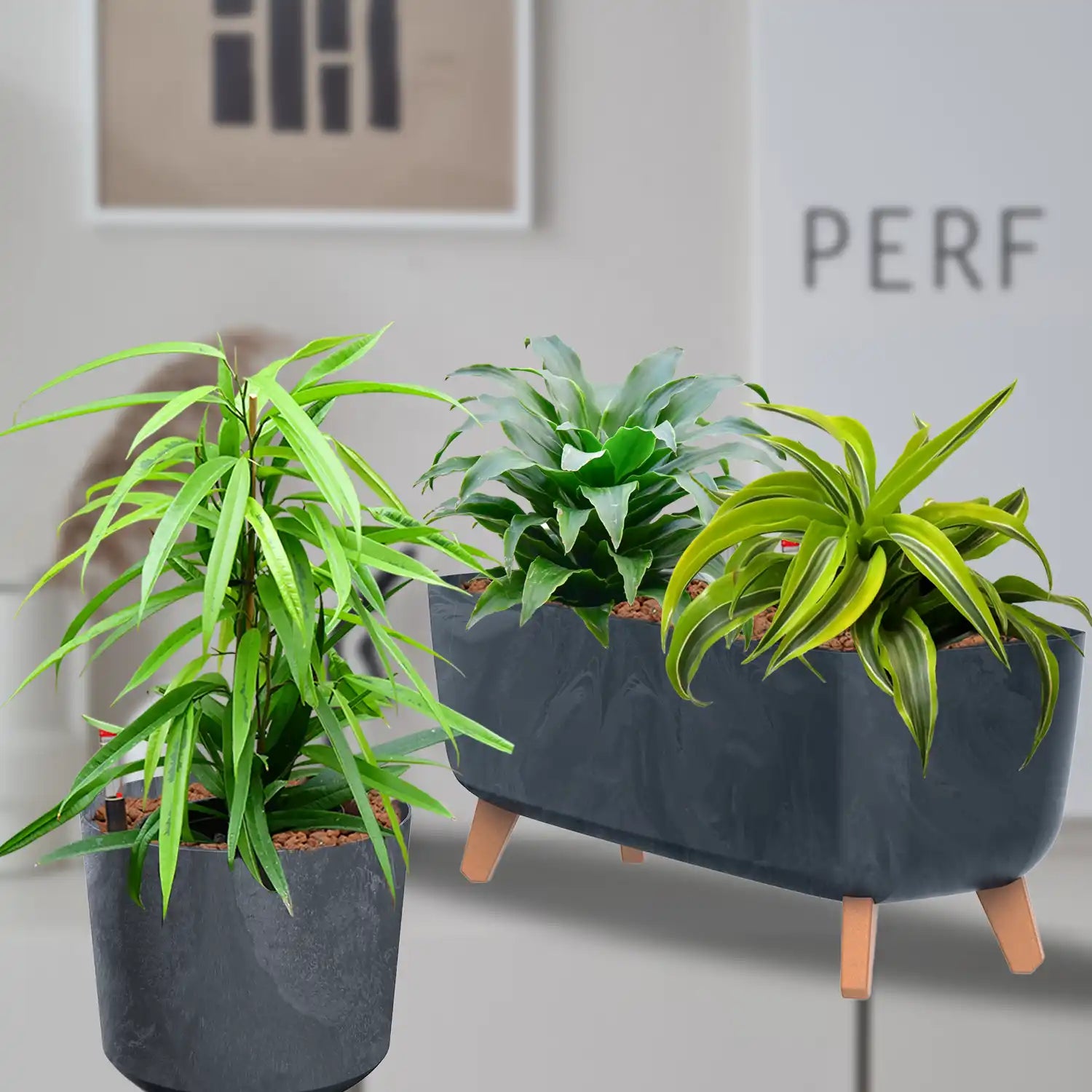 Dracaena Pflanzen sind eine pflegeleichte und bewährte Pflanzendeko für die Empfangstheke oder eine Anrichte in deinem Business. Das längliche Pflanzgefäß auf Füßen für 2 Pflanzen in Hydrokultur plus 1 einzelner Topf für den Schreibtisch, sind eine professionell und moderne Lösung und mit Gießanzeiger ganz einfach in der Pflege.