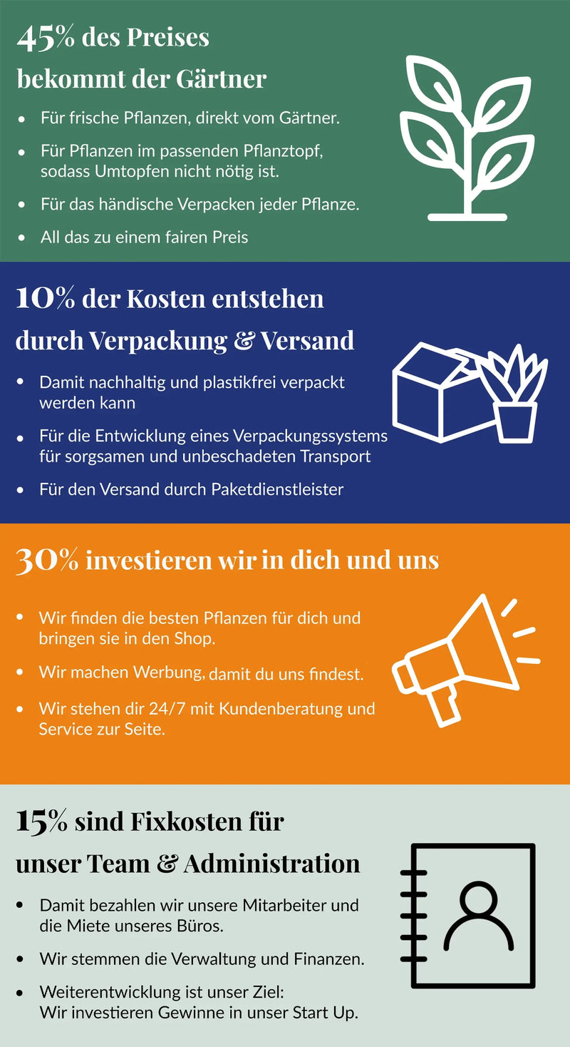 Mit dieser Übersicht möchten wir dir einen kleinen Einblick in unsere Preiszusammensetzung geben und dich ermutigen, unsere Pflanzenqualität und den gesamten Service drumherum zu testen.