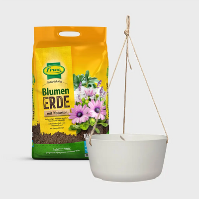 Mithilfe der mitgelieferten Erde kannst du den Korb mit Erde füllen und deine Pflanze direkt einpflanzen, damit sie bei dir Zuhause weiter wachsen kann. Die Innenseite des Korbes ist mit einer Kunststoffauskleidung versehen, die ein Auslaufen verhindert, jedoch sollte kein Wasser im Topf stehen. Möchtest du den Korb für deine Pflanzen auf dem Balkon nutzen, lohnt es sich vor dem Einpflanzen Löcher in die Folie zu ritzen, damit überschüssiges Wasser ablaufen kann.