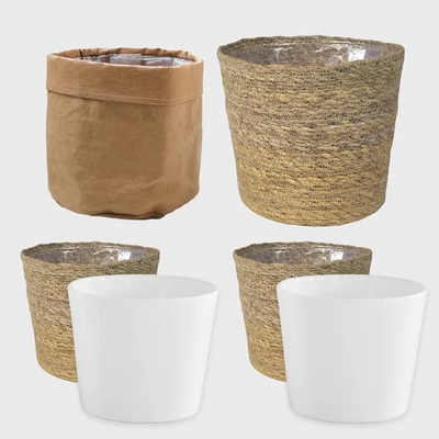 Dieses trendige Übertopf-Set passt perfekt zur 6er Pflanzenbox. Die Töpfe sind eine Mischung aus Keramik, Seegrasgeflecht und trendigen Pflanzsäcken mit Innenfolie. Einfach mit bestellen und deine neuen Pflanzen kinderleicht in deiner Wohnung dekorieren. Erhältlich in verschiedenen Farben.