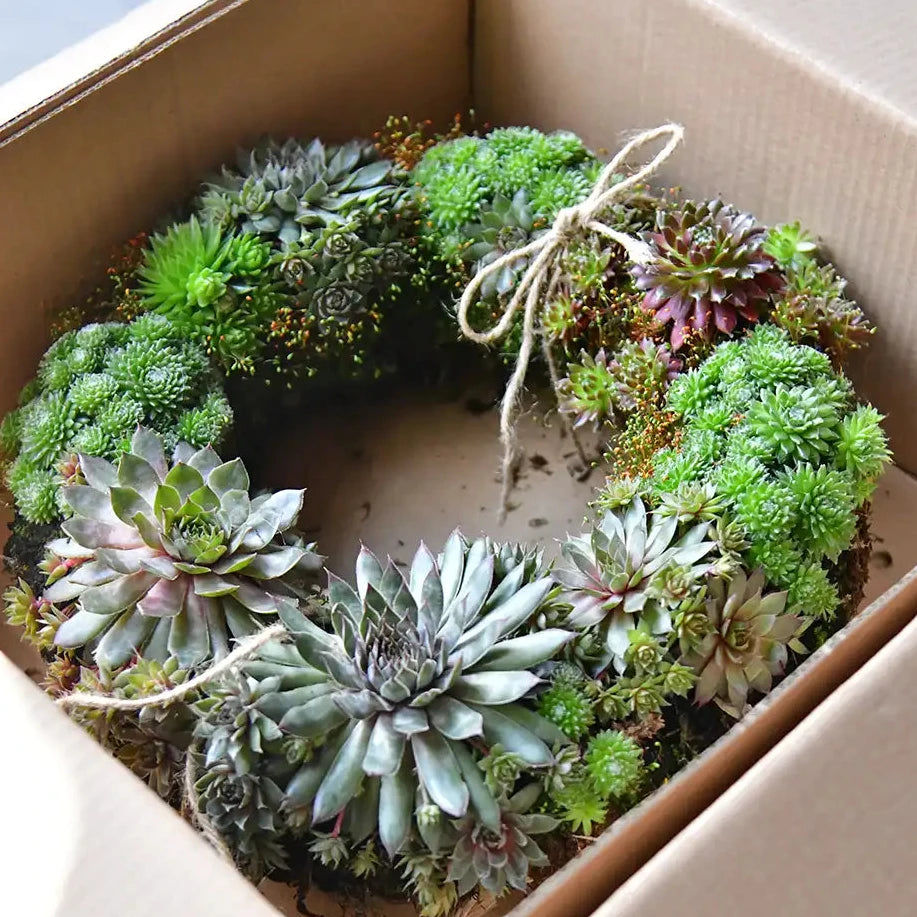 Der Kranz ist sehr pflegeleicht, benötigt je nach Wetter nur alle 2-3 Wochen Wasser. Wenn er leicht geworden ist, kannst du ihn zum Gießen. Vom Gegen saugt er sich alleine voll. Die Sempervivum wachsen sehr langsam und bleiben den ganzen Sommer in Form. Im Winter kann der Kranz draußen bleiben. Er bleibt das ganze Jahr und sollte hin und wider beschnitten oder gereinigt werden.