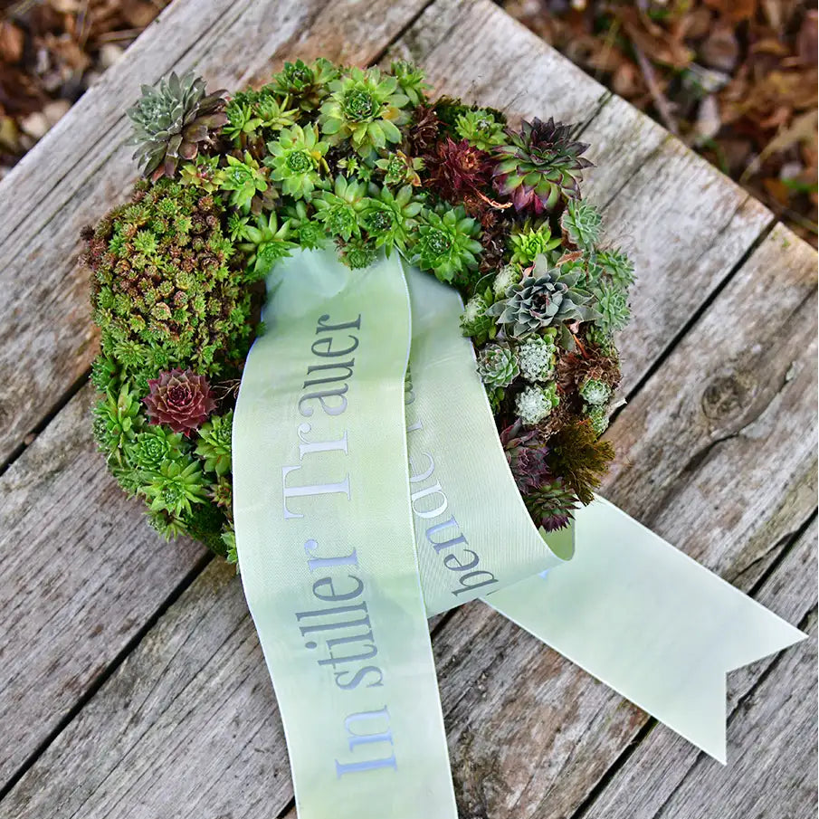 Du suchst einen stilvollen und individuellen Trauer Cranz, der nicht nach zwei Wochen verblüht, sondern weiter das Grab schmückt? Dann bist du bei Green Me Up genau richtig. Unsere lebenden Kränze aus Hauswurz und Torfmoos sind zeitlos modern und winterhart.