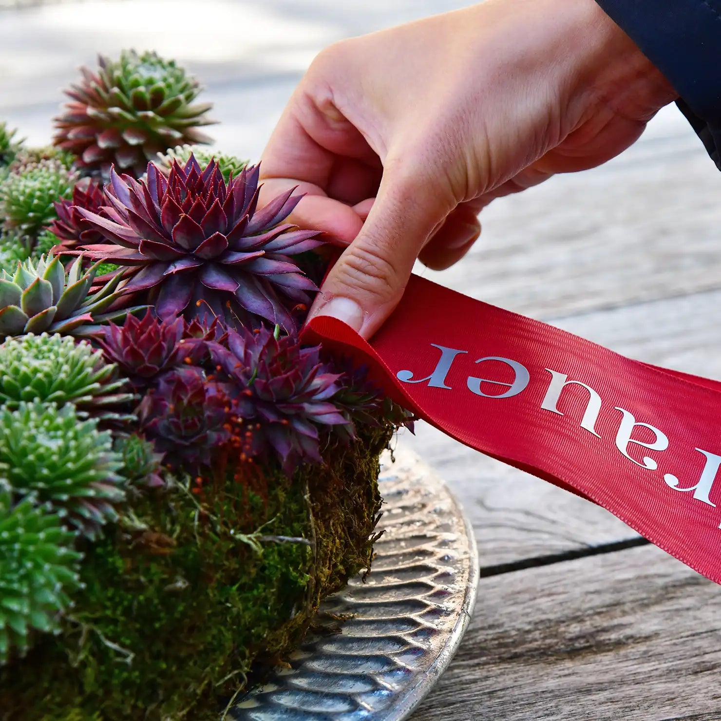 Der mit Sempervivum Sukkulenten bewachsene Mooskranz ist eine moderne Alternative zum traditionellen Trauerkranz und dazu etwas das bleibt. Er ist langlebig und winterhart. In dieser Größe von 25cm kann er als ganzjähriger Grabschmuck auf einem Urnengrab genutzt werden. Wähle deine Schleifenfarbe und wir bedrucken diese mit deinem persönlichen Text.