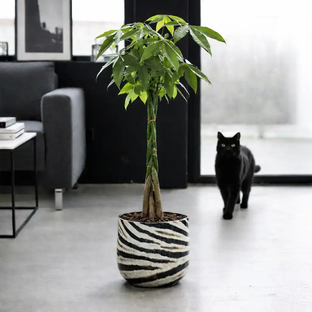 Diese große Palme macht einfach Glücklich, weil sie unkompliziert ist, schnell wächst und mit ihren gefingerten Blättern und dem geflochtene Stamm sehr besonders ist. Deine Wohnung wird mit diesem Baum zu einem Wohlfühlort für dich und deine Katze, denn die Pachira ist ungiftig und wird auch nicht so schnell angeknabbert.